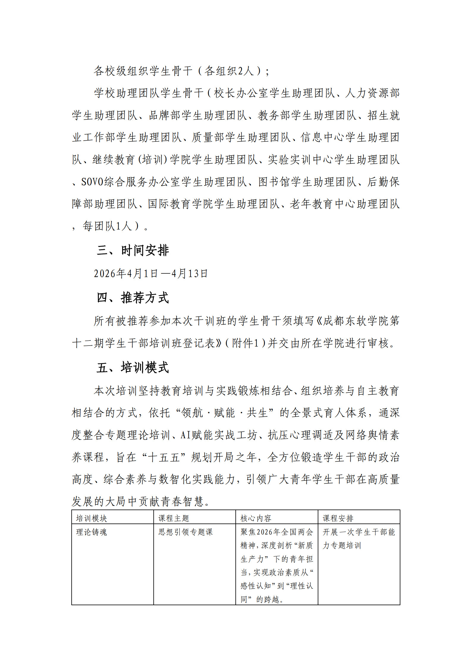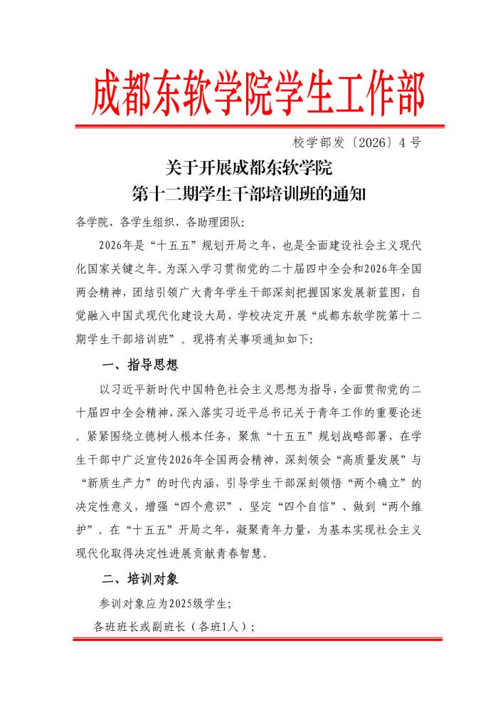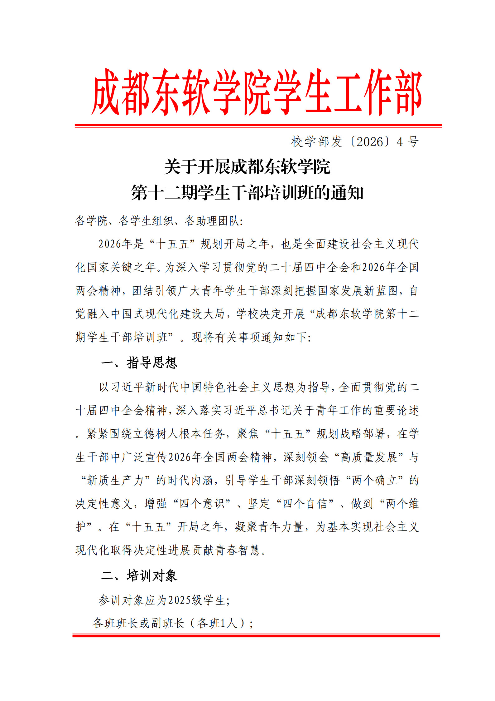 附件1:4-校学部发〔2026〕4号 关于开展成都东软学院第十二期学生干部培训班的通知